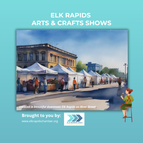 Come enjoy our 31st Annual Arts and Crafts Shows, located in the heart of the Village of Elk Rapids on River Street.  Our shows feature 60+ artisans and crafters.  The show features art and homemade items in many areas including coastal art, home decor, jewelry, ceramics, woodcrafts, photography, skincare products, candles, soups, apparel, specialty food and much more.